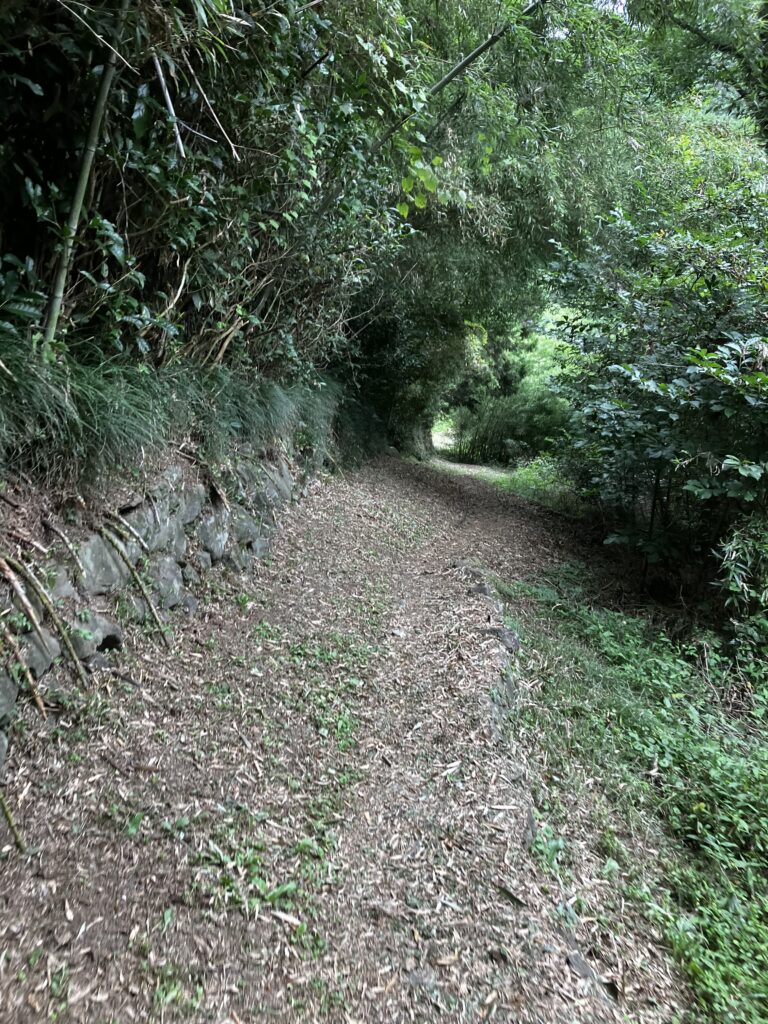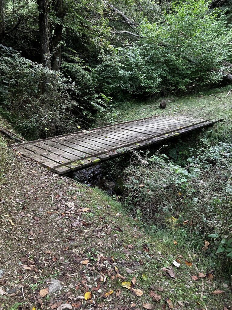 劣化した木の橋を過ぎると下のような山道に入ります。登山初心者な私達からするとあえて整えすぎてない自然のままの姿に感動しました。真ん中の木の橋の下は細い小川になっててワクワクしました。(ここも経年劣化してるので渡る時気をつけてください)